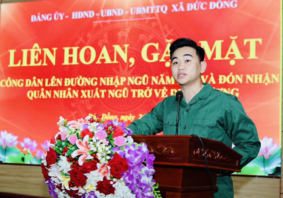 Đại diện công dân nhập ngũ năm 2026 Nguyễn Xuân Chung, thôn Đồng Quang phát biểu cảm tưởng tại buổi gặp mặt.