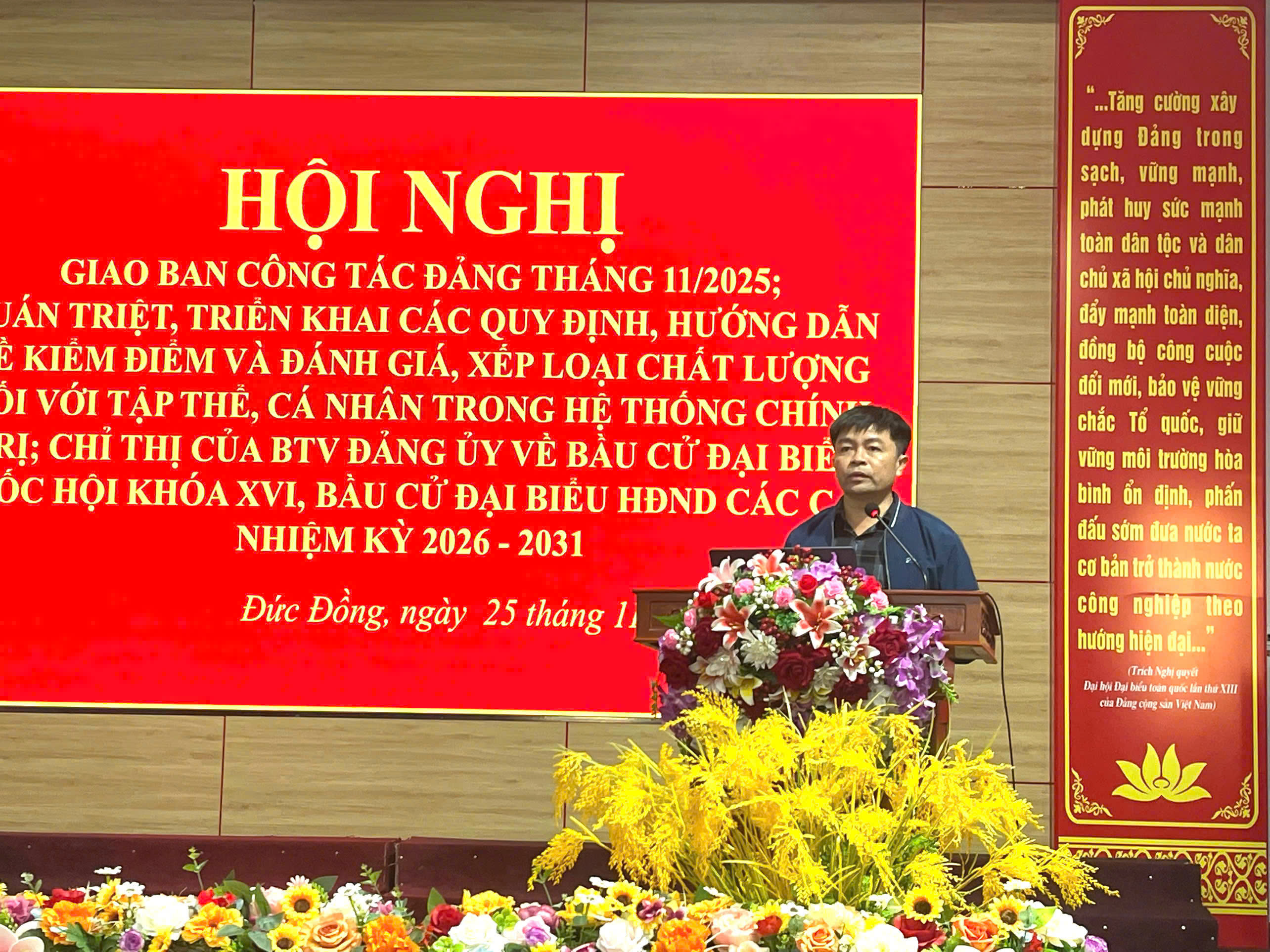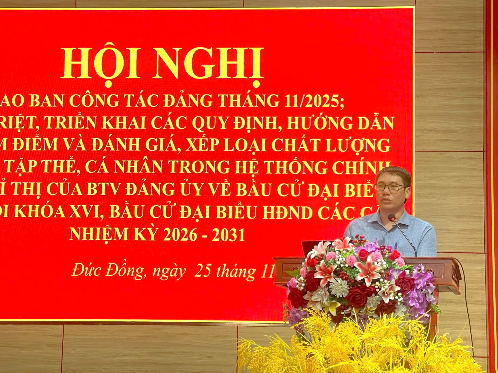 Thực hiện chương trình công tác, chiều ngày 25/11/2025, Ban Thường vụ Đảng ủy xã Đức Đồng tổ chức Hội nghị giao ban công tác Đảng, MTTQ tháng 11, triển khai nhiệm vụ tháng 12 năm 2025; quán triệt, triển khai các quy định, hướng dẫn về kiểm điểm và đánh giá, xếp loại chất lượng tập thể, cá nhân trong hệ thống chính trị năm 2025; quán triệt Chỉ thị của Ban Thường vụ Đảng ủy về công tác bầu cử đại biểu Quốc hội khóa XVI và đại biểu HĐND các cấp, nhiệm kỳ 2026-2031. Hội nghị có sự tham dự của 86 đồng chí là cán bộ chủ chốt của xã và các đảng bộ, chi bộ trực thuộc.
